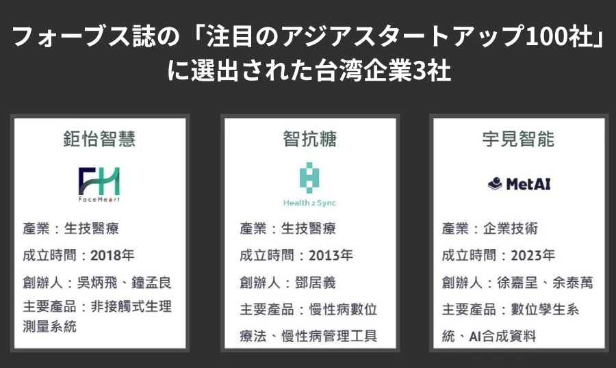 こうした背景のもと、「フォーブス・アジア注目の100社」に選出された台湾企業が昨年の僅か1社(PopChill 拍拍圈)から、今年は3社(FaceHeart_鉅怡智慧、Health2Sync_智抗糖、MetAI_宇見智能)に増加しました。