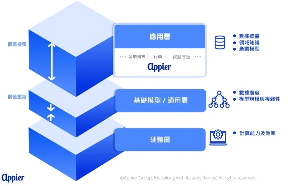 AppierはAIにおける階層モデルでAIアプリケーションの層に属します。アプリケーション層で勝敗を分ける鍵は、データの壁、ドメイン知識、産業モデルです。
